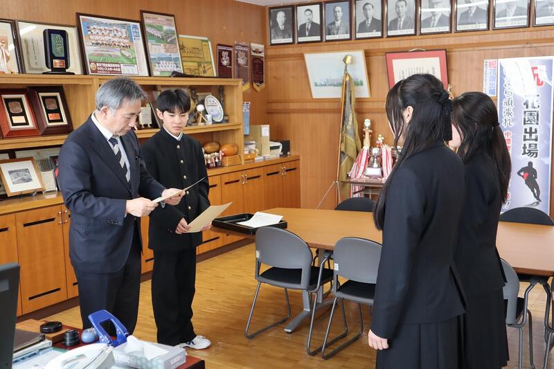 はじめに、各部活動の表彰伝達を実施しました。女子バレーボール部、写真部、男子バスケットボール部、バドミントン部、サッカー部の表彰を行い、そして、男子バスケットボール部と、バドミントン部と、サッカー部の決意表明と、激励会を行いました。その後、冬季休業前集会を行いました。