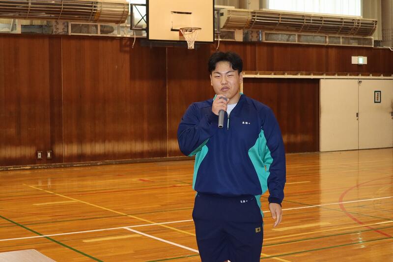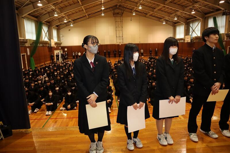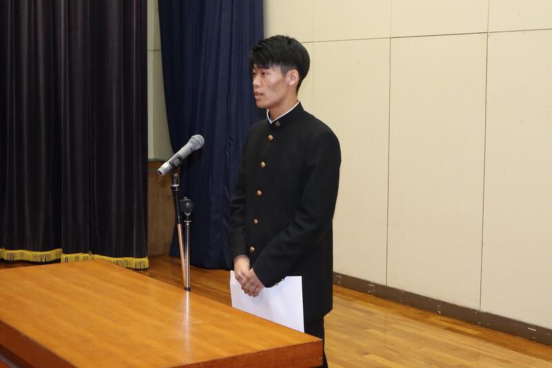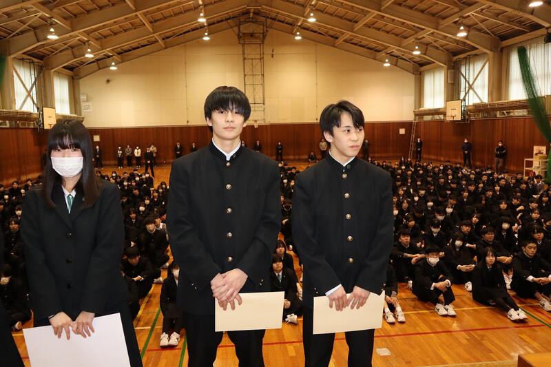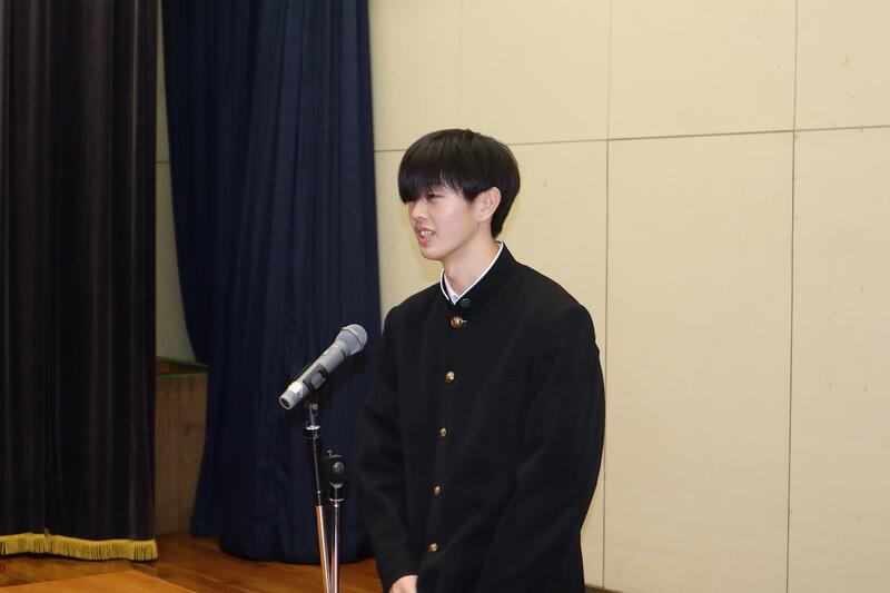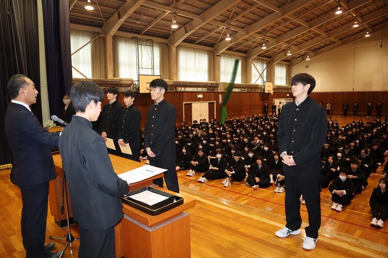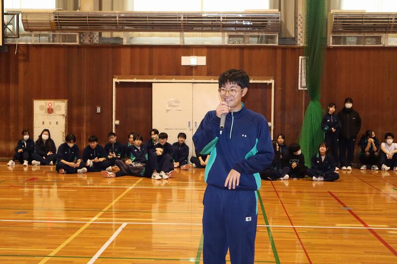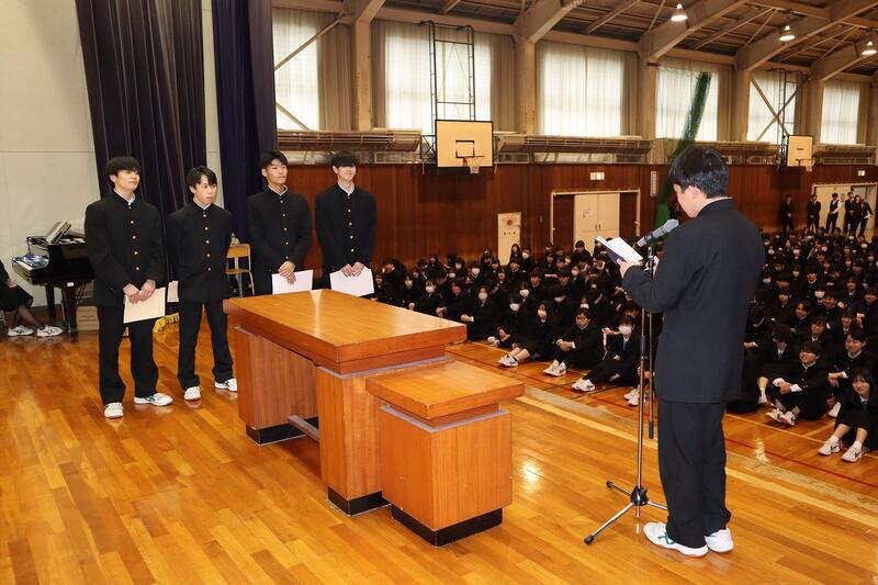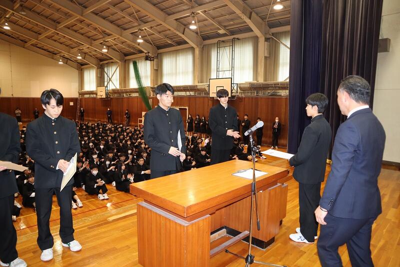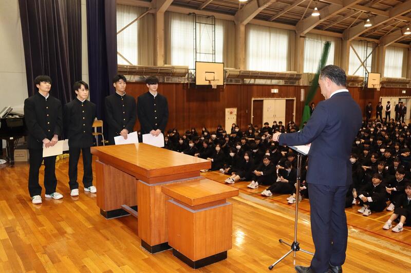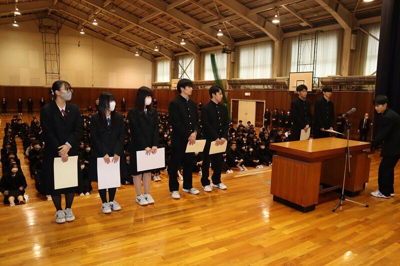 はじめに、各部活動の表彰伝達を実施しました。女子バレーボール部、写真部、男子バスケットボール部、バドミントン部、サッカー部の表彰を行い、そして、男子バスケットボール部と、バドミントン部と、サッカー部の決意表明と、激励会を行いました。その後、冬季休業前集会を行いました。