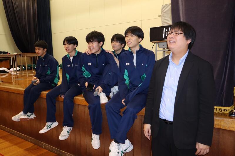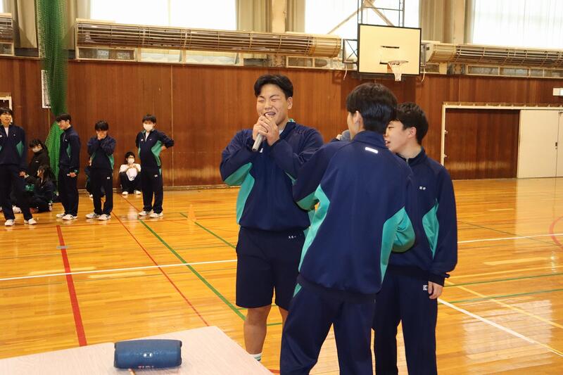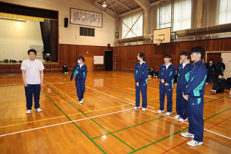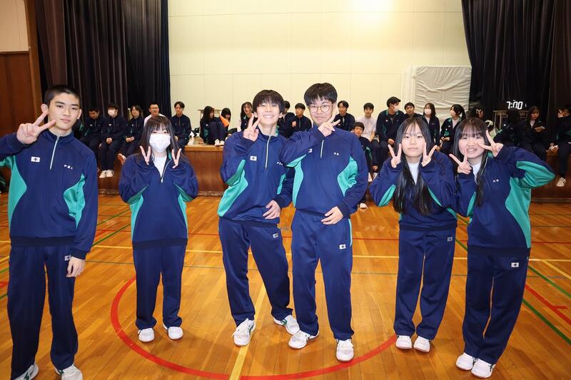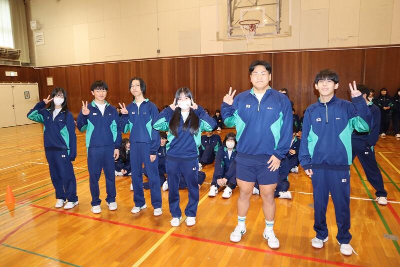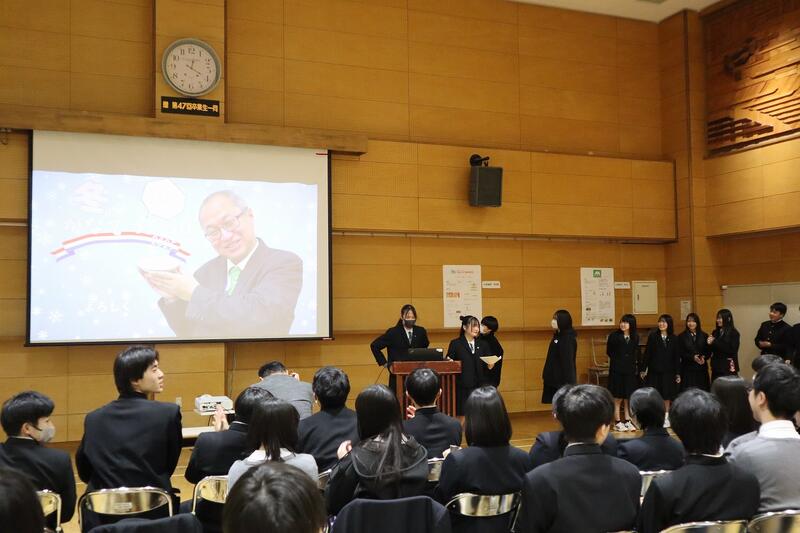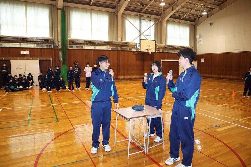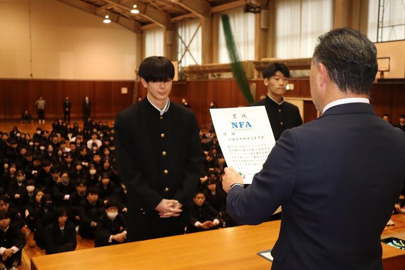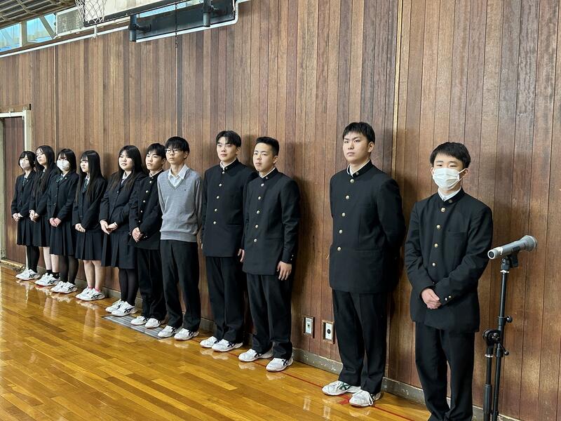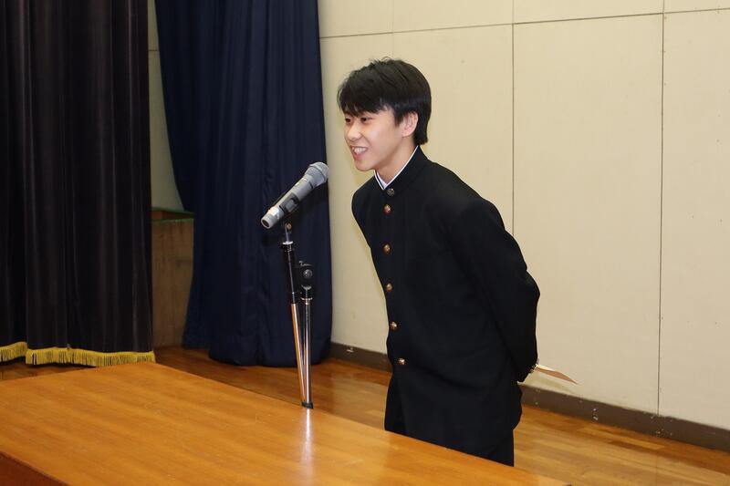 はじめに、各部活動の表彰伝達を実施しました。女子バレーボール部、写真部、男子バスケットボール部、バドミントン部、サッカー部の表彰を行い、そして、男子バスケットボール部と、バドミントン部と、サッカー部の決意表明と、激励会を行いました。その後、冬季休業前集会を行いました。