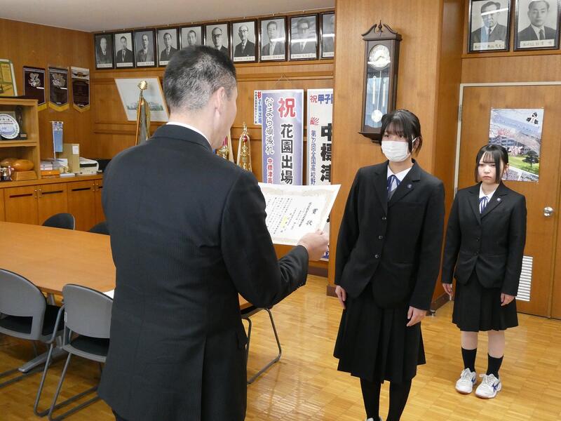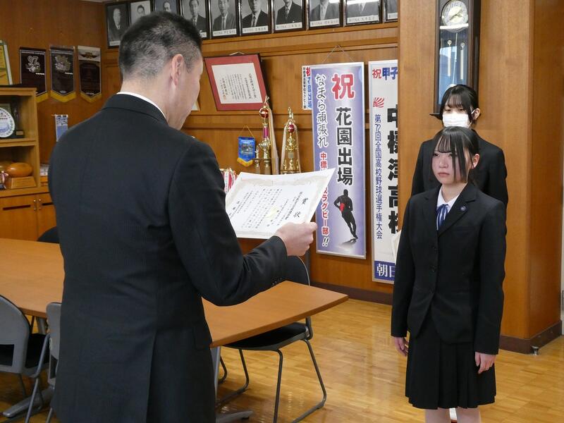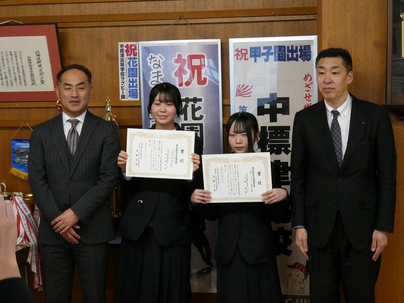絆づくりメッセージコンクールの、写真メッセージ部門で大橋さん、ことばメッセージ部門で渡辺さんが、根室管内最優秀賞に選ばれ、表彰されました。