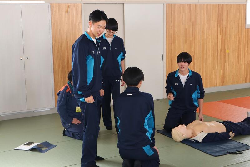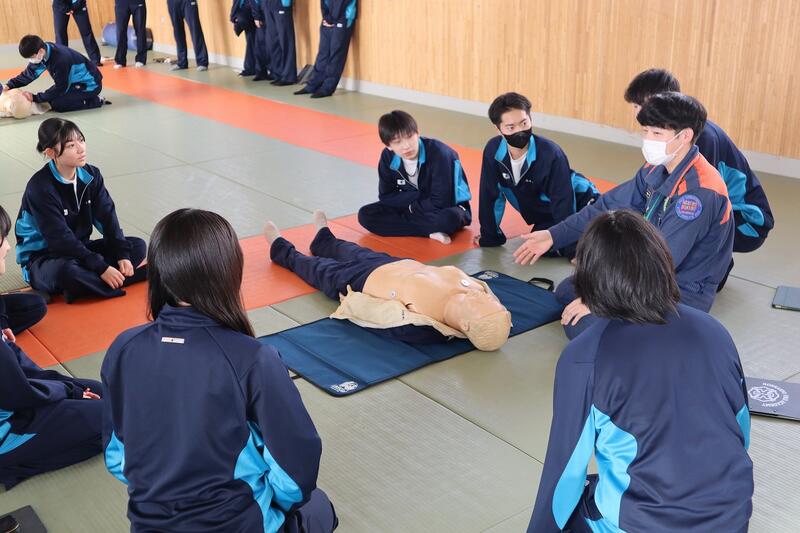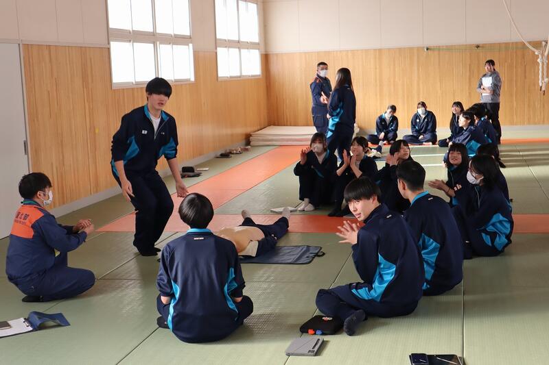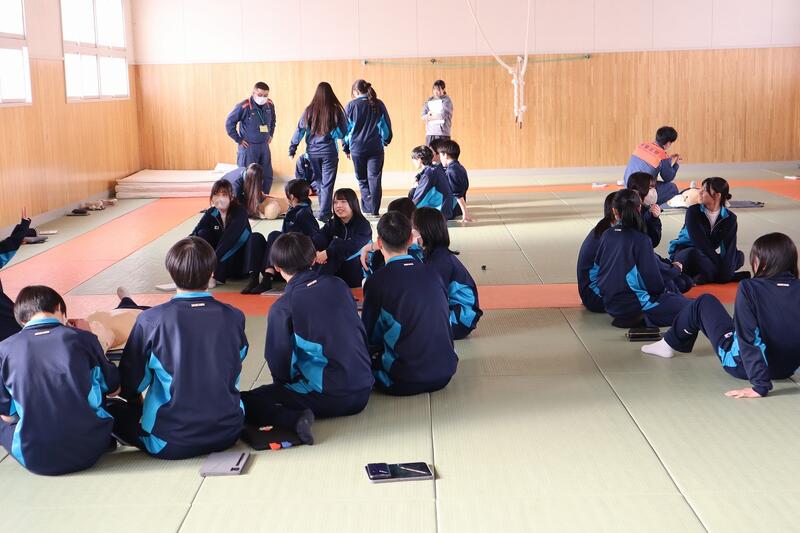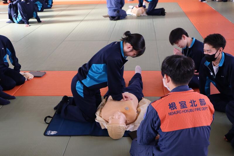 令和8年2月4日(水)に、1 学年の各学級で救命救急講習を、多目的ホールや格技場で実施しました。講師は根室北部中標津消防署の方に来校していただき、応急手当や心肺蘇生法、AEDの使用方法について実践的に学びました。また、止血方法と熱中症への対応方法についても学びました。生徒は各学級9~10人程度を 1 グループとして 4 グループに分かれ受講しました。生徒は皆真剣に取り組んでいました。