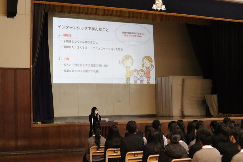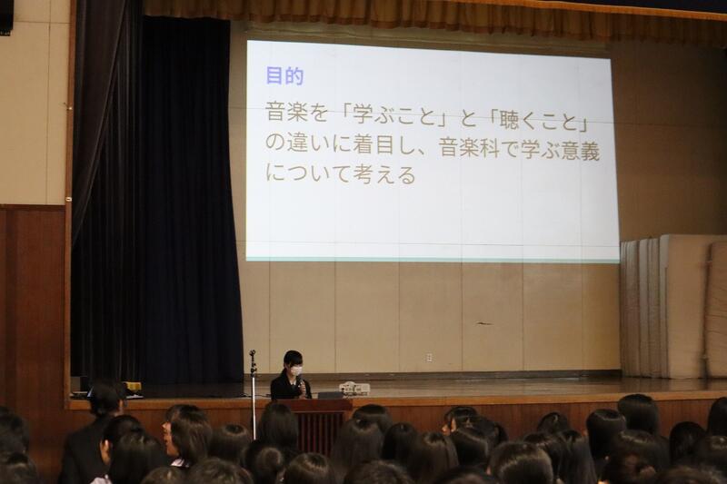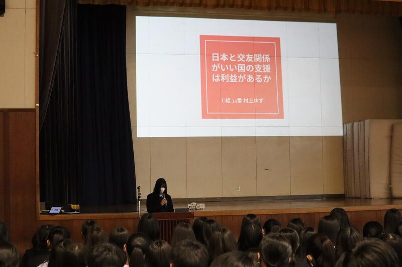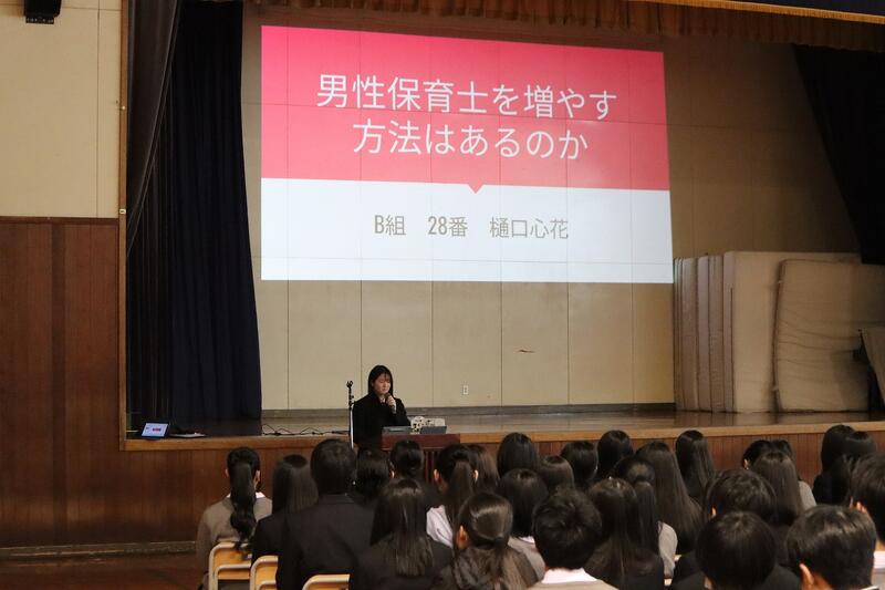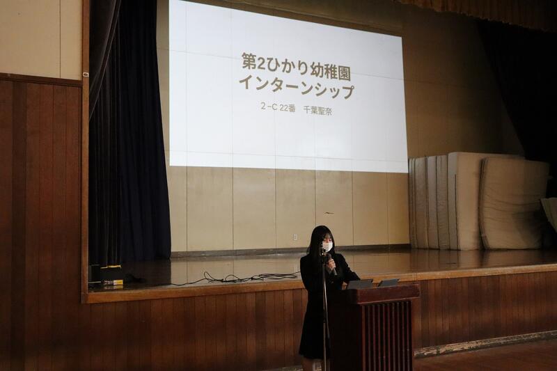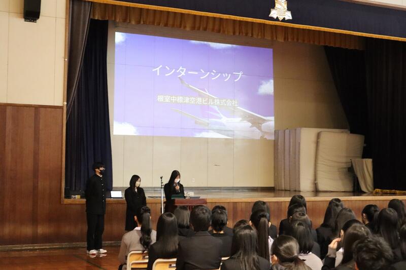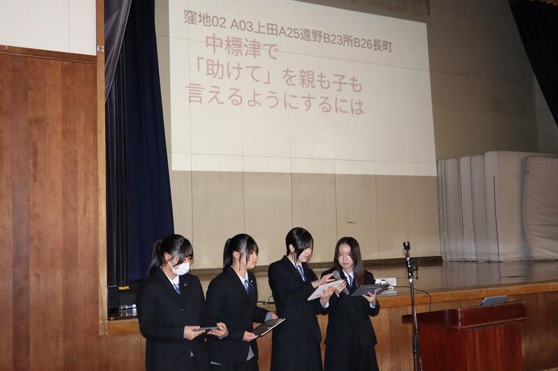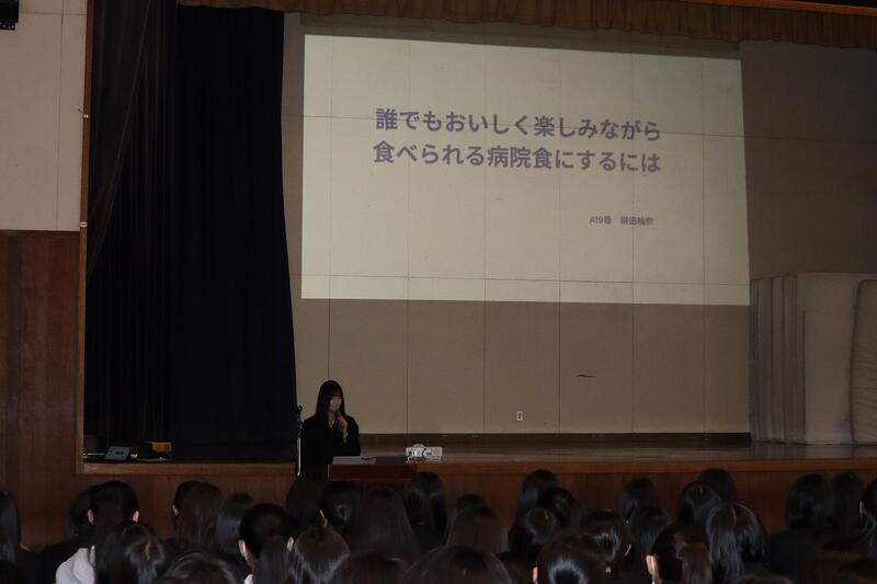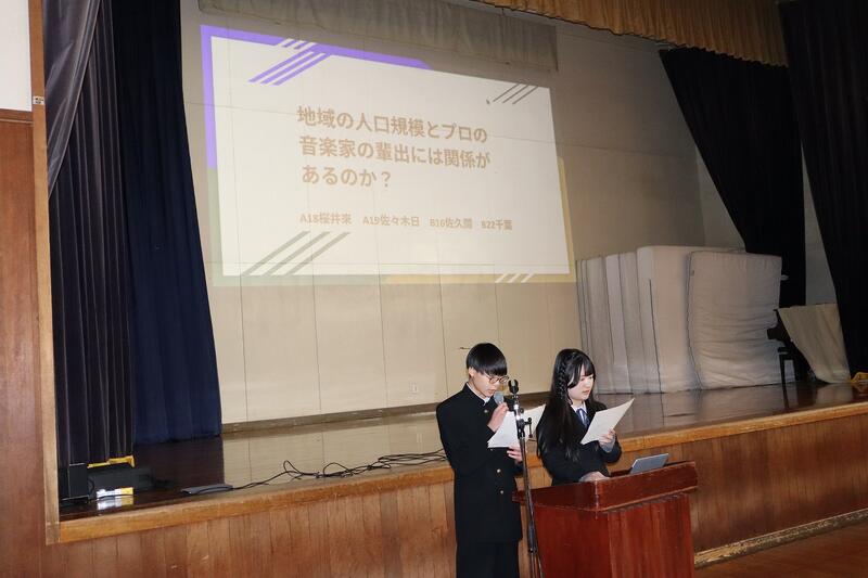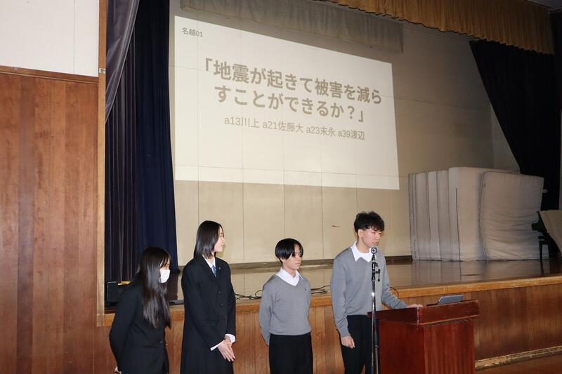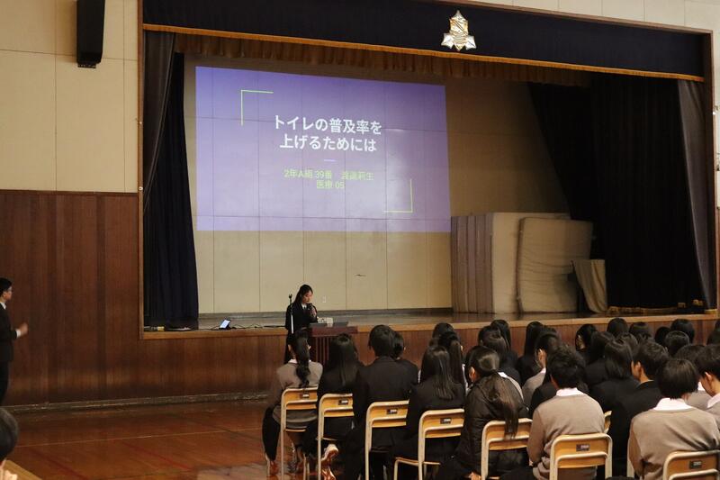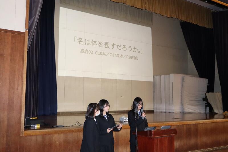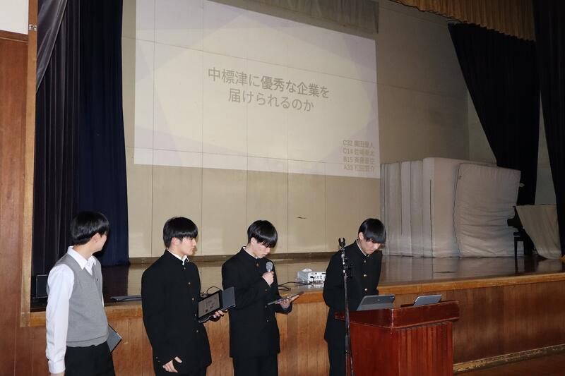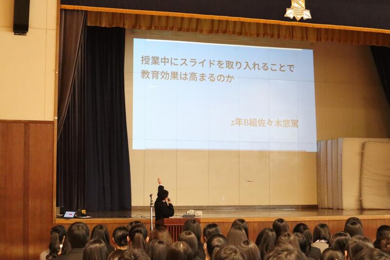 1年生はグループ探究の優良班の発表を、2年生はインターンシップでの探究活動の発表および個人探究活動の優良班・優良者の発表を行いました。