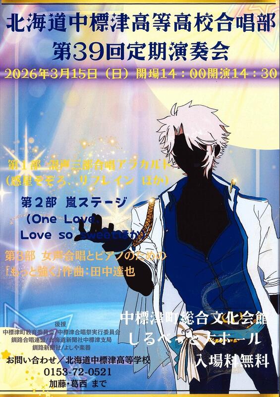 下記のとおり、第39回定期演奏会を開催いたします。今年度は北海道合唱コンクールで金賞を受賞するなど、目標以上の結果をいただくことができました。今回の定期演奏会は一年間の集大成となります。また、第二部では嵐ステージをお送りします。ちょうど北海道が嵐のコンサートで盛り上がっている日に、中標津でも嵐の曲をお楽しみいただけます!ドームのような派手な演出はございませんが、本校の生徒の日頃の練習の成果をどうぞお楽しみください。