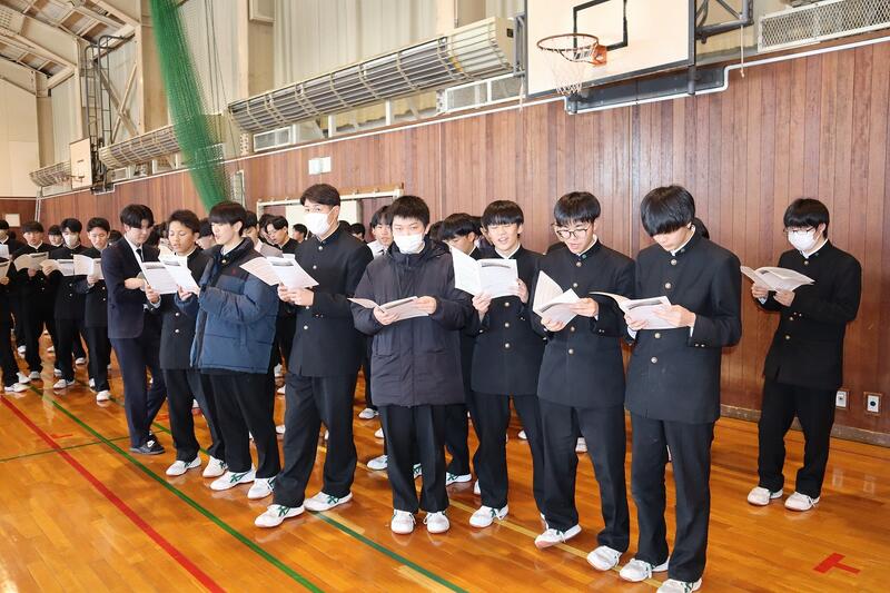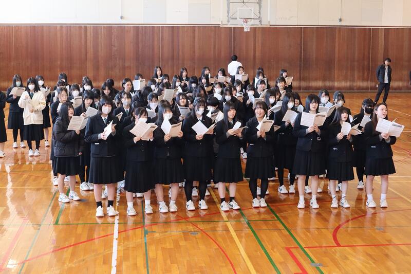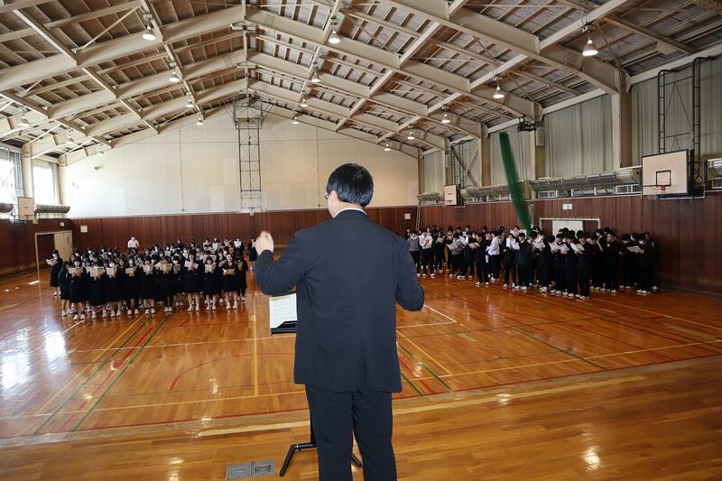 卒業式では混声3部合唱の形式で卒業生も含めて全校生徒で歌います。